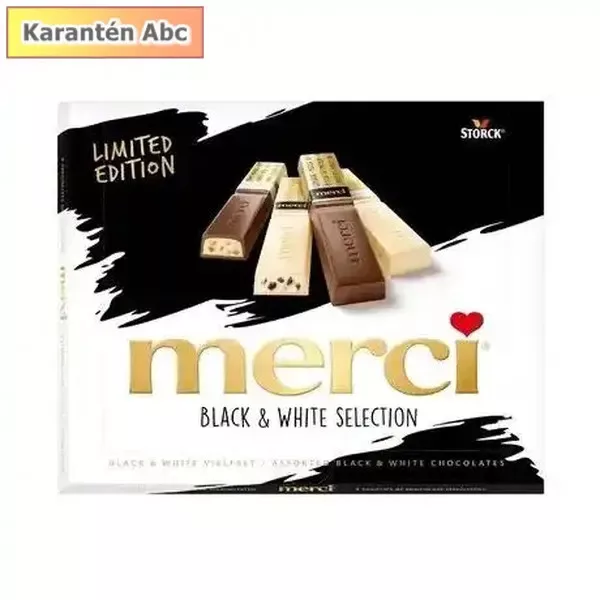 A Merci desszert Black & White 240 g egy gondosan összeállított csokoládéválogatás, amely a krémes fehér csokoládé és a karakteresebb, kakaósabb ízvilágú csokoládék kontrasztjára épül. A dobozban különféle formájú és ízű desszertek találhatók, így minden falat egy kicsit más élményt ad, mégis harmonikusan illeszkednek egymáshoz.
